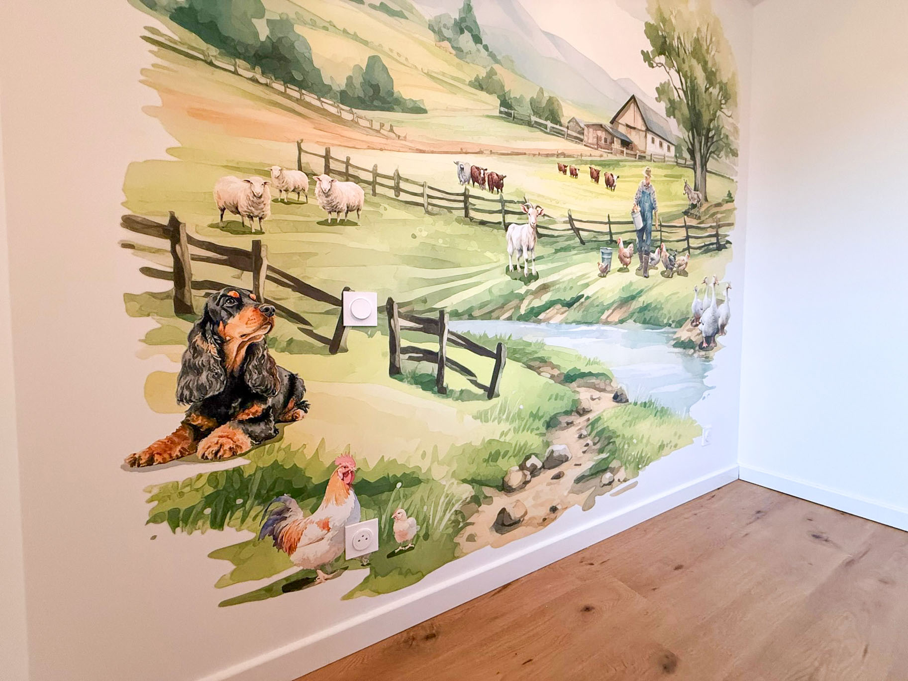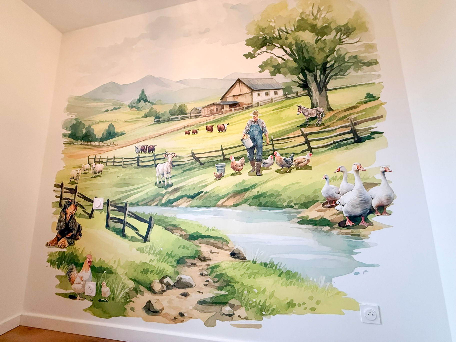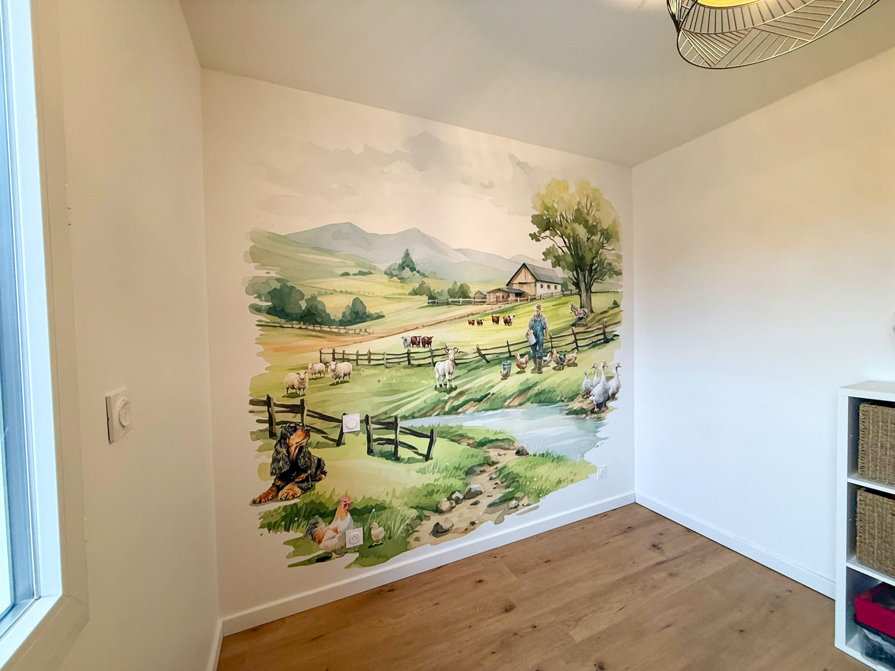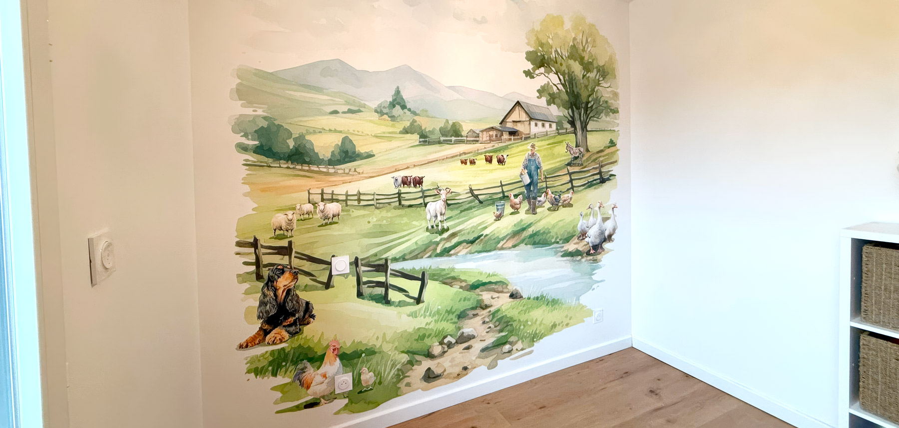 Le projet a inclus un travail de composition graphique ainsi qu’une simulation réaliste, permettant de visualiser le rendu final avant impression. L’ambiance met en scène des animaux de la ferme illustrés façon aquarelle, apportant une touche poétique et apaisante à l’espace.