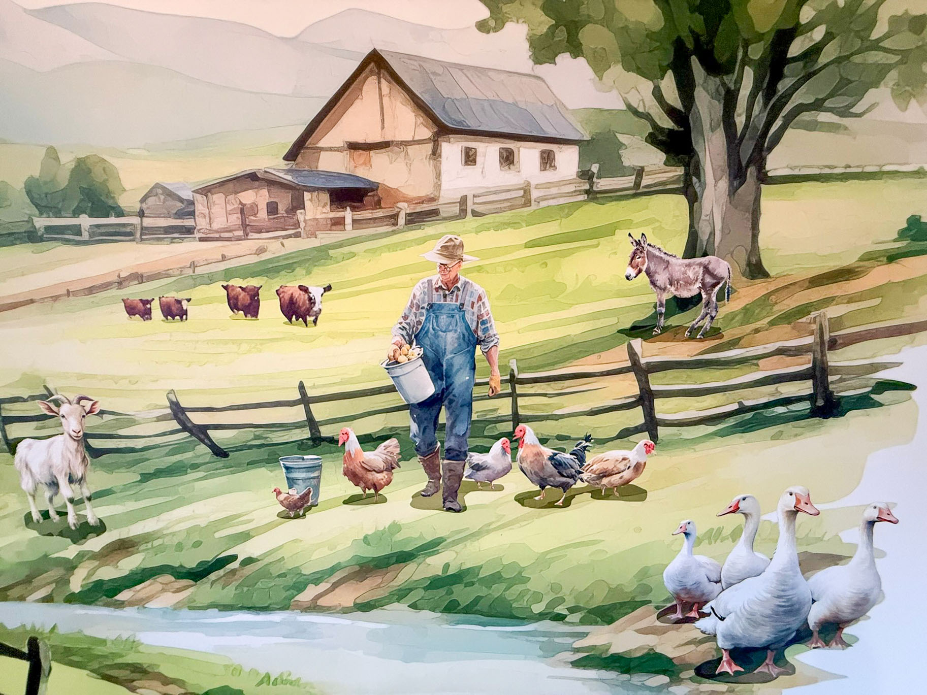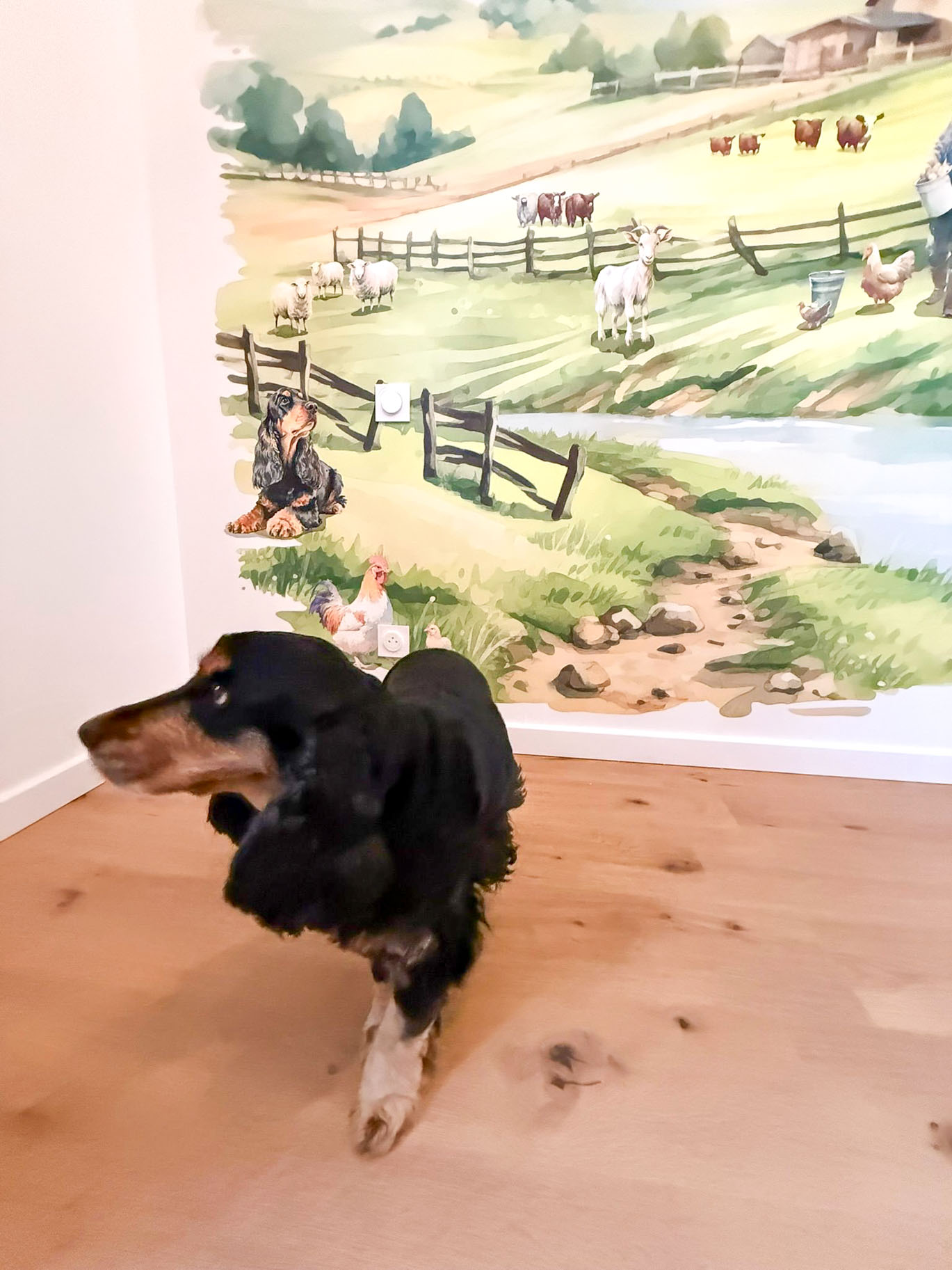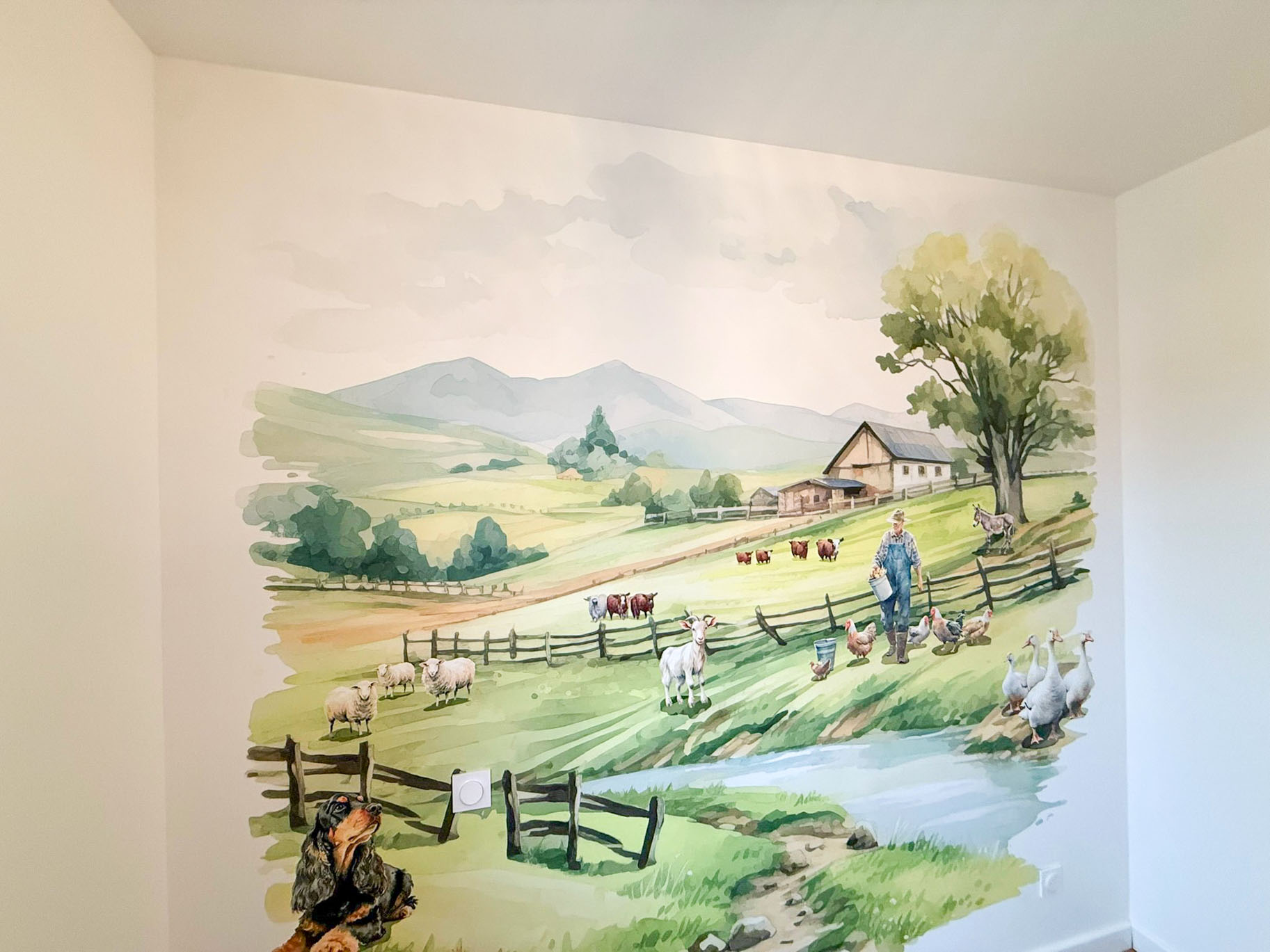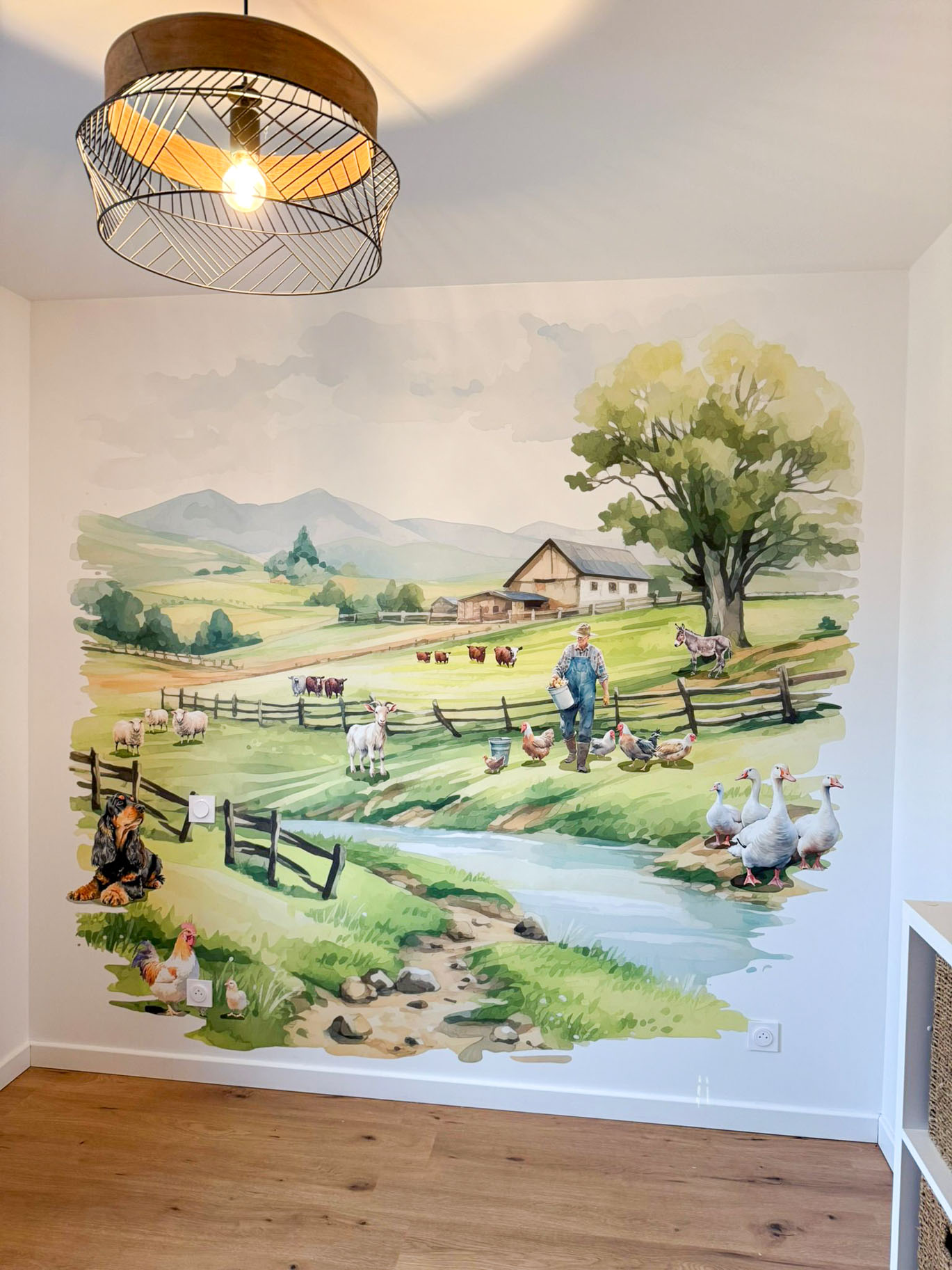 Le projet a inclus un travail de composition graphique ainsi qu’une simulation réaliste, permettant de visualiser le rendu final avant impression. L’ambiance met en scène des animaux de la ferme illustrés façon aquarelle, apportant une touche poétique et apaisante à l’espace.