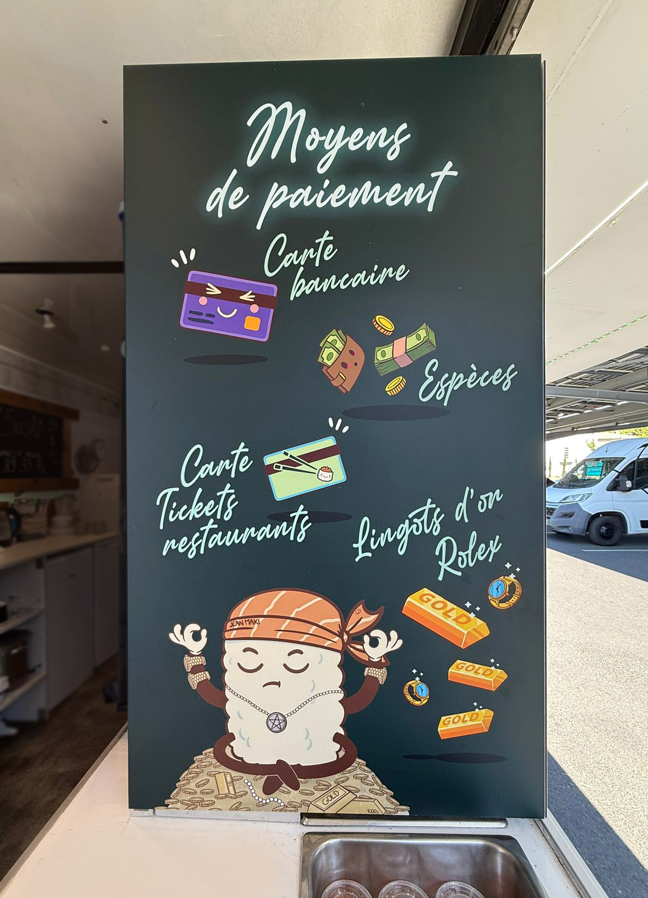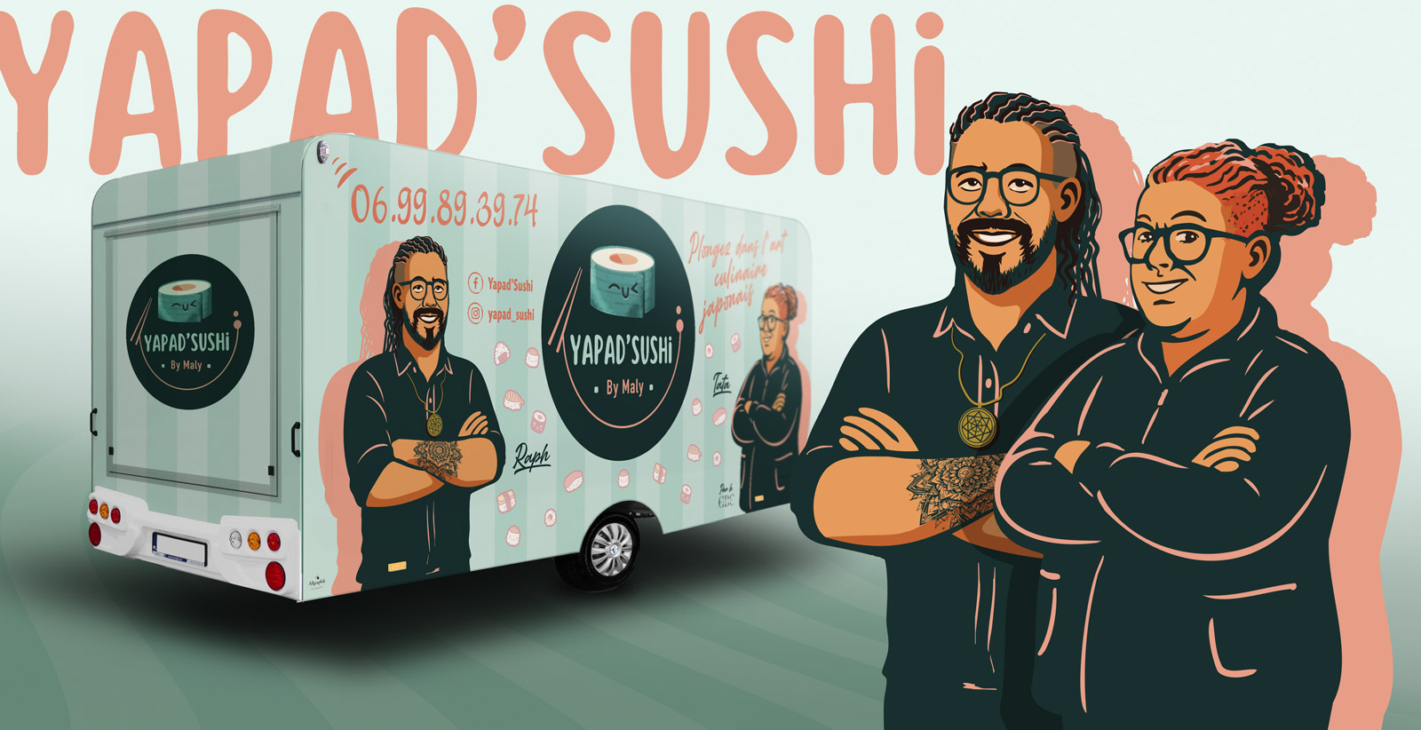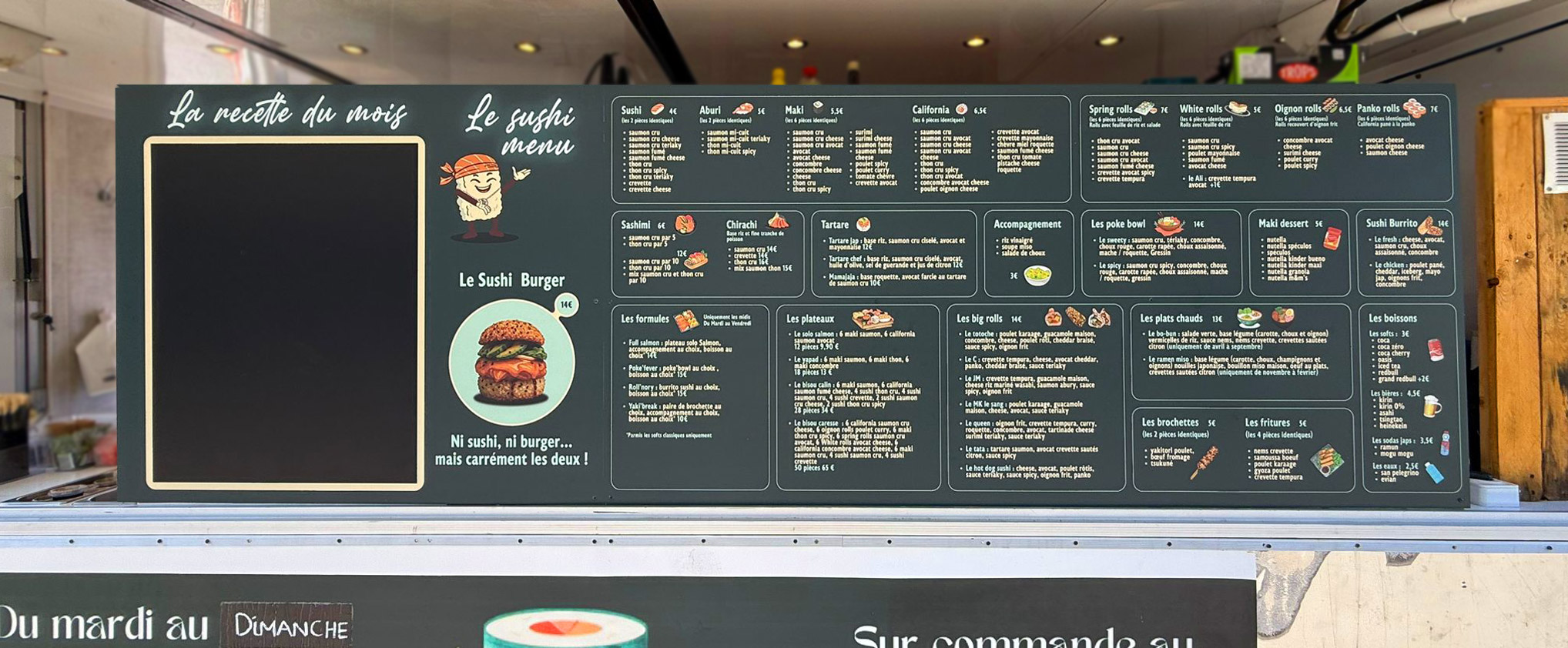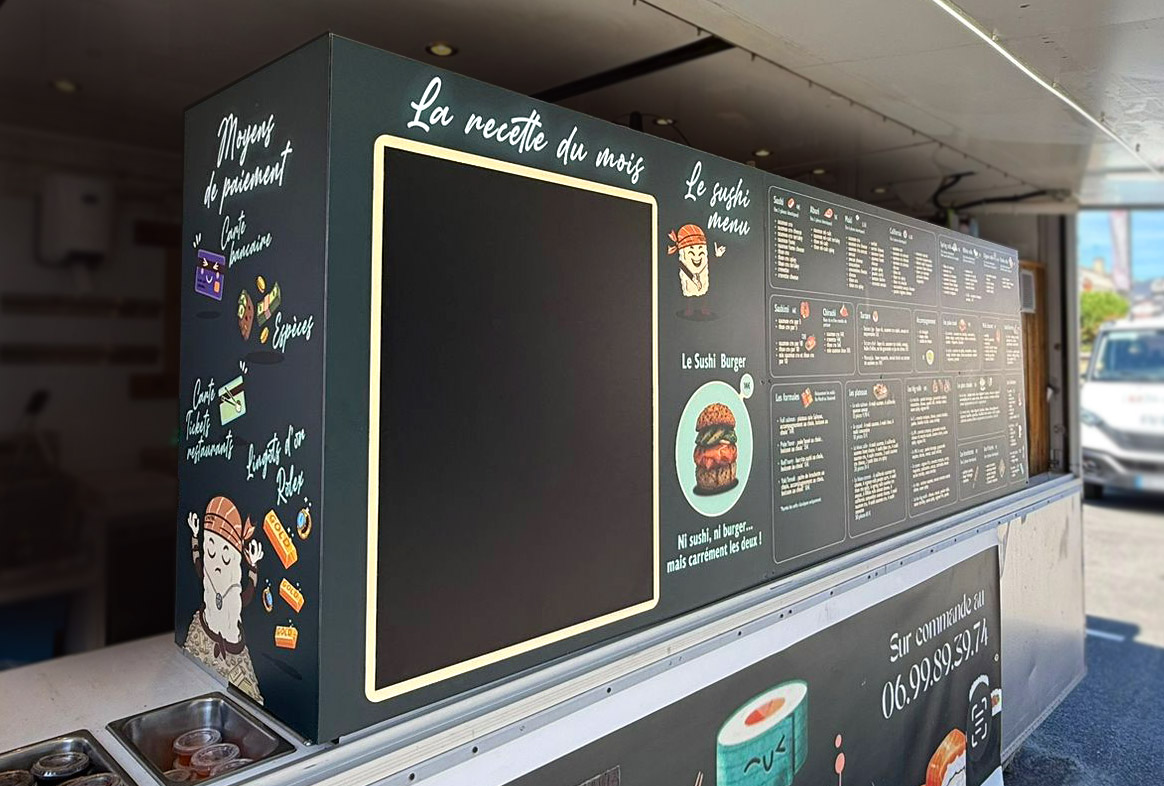 Pour accompagner le développement de la communication du foodtruck Yapad’Sushi, nous avons pris en charge la création graphique complète du covering de leur véhicule, ainsi que l’impression et la pose de l’ensemble des supports de communication nécessaires à son activité. Pour le menu, nous avons réalisé une mise en page claire, lisible et appétissante, adaptée à une consultation rapide sur place, imprimée sur un support résistant à l’usage quotidien.